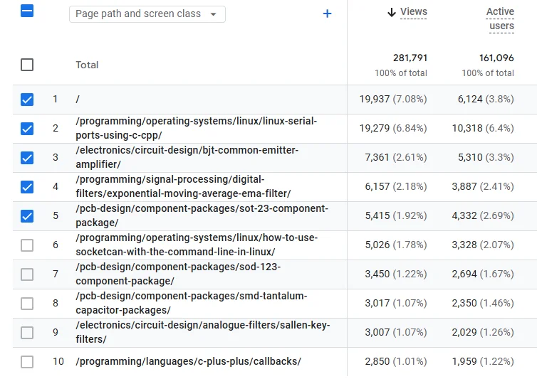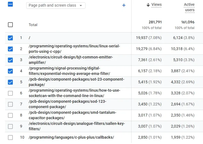 2025 saw 282k (282,000) page views for blog.mbedded.ninja. This is down from 505k last year, a decrease of 223k or 44%. That’s quite the drop! AI is the likely culprit, with less people visiting the site due to just using AI to answer technical embedded engineering questions, and AI powered search summaries (i.e. the one Google uses) which means the user does not need to visit the site. This is a placeholder for the reference: fig-stats-graphs shows the page views and other key stats per year.