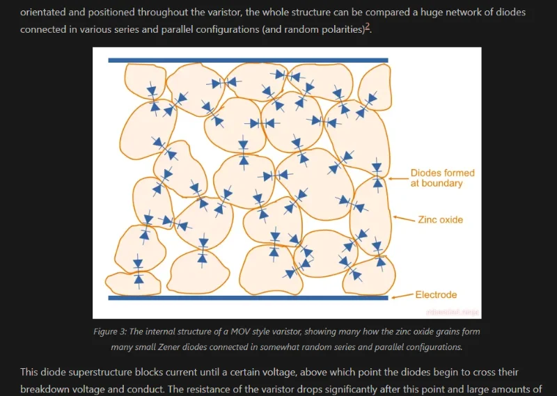 Added more info on varistors, including the internal structure of a MOV style varistor and how they work.