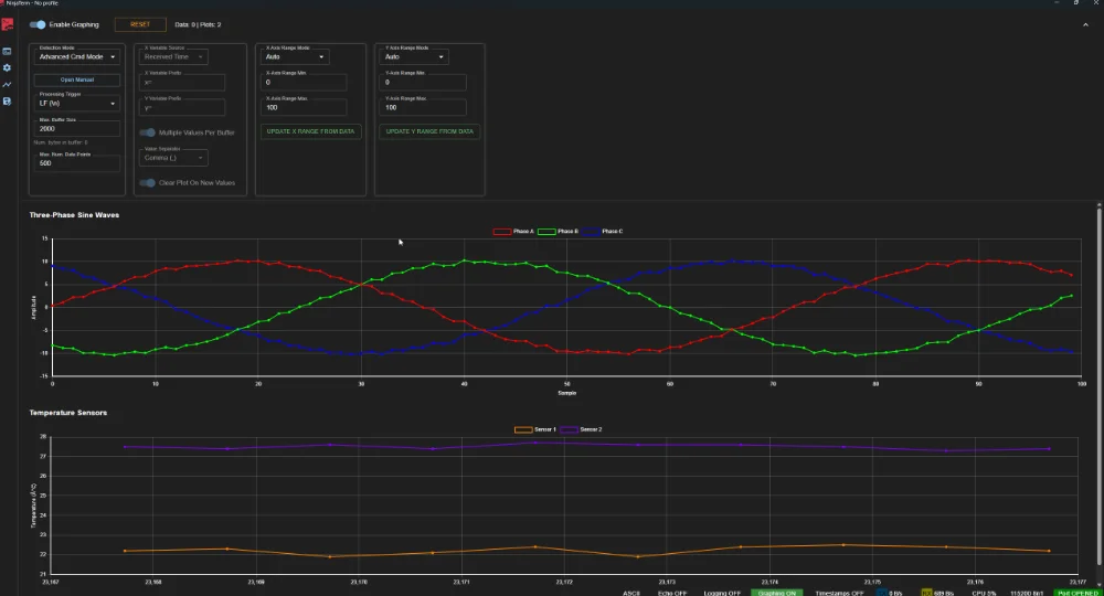 Advanced graphing features have been added to NinjaTerm. This includes the ability for the MCU to send commands to NinjaTerm to create figures, define axis titles and trace labels, and insert/clear data. This is done with in-band ASCII based commands (starting with $NT: and ending with ;) which are extracted from the incoming serial stream. An example of what the incoming data might look like is: