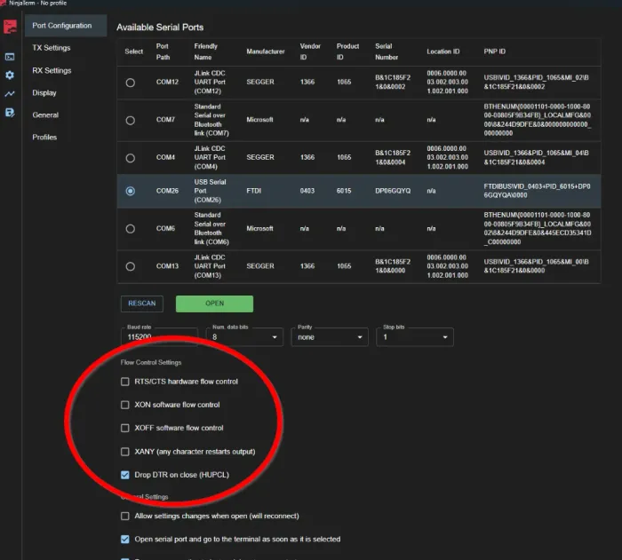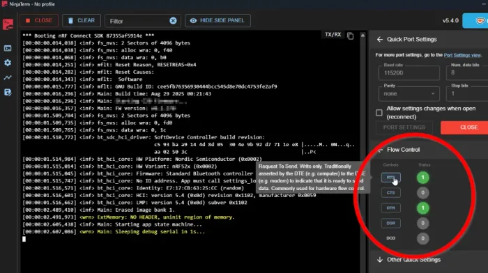Flow control support has been added to NinjaTerm. Now on the port settings view you can select from a number of different flow control options.
