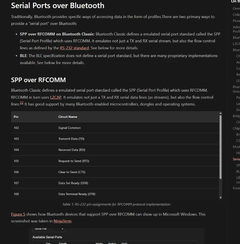 Added info on virtual serial ports over Bluetooth to the Bluetooth page, including the SPP protocol over RFCOMM for Bluetooth Classic, and the various proprietary virtual serial port protocols for Bluetooth Low Energy (BLE).
