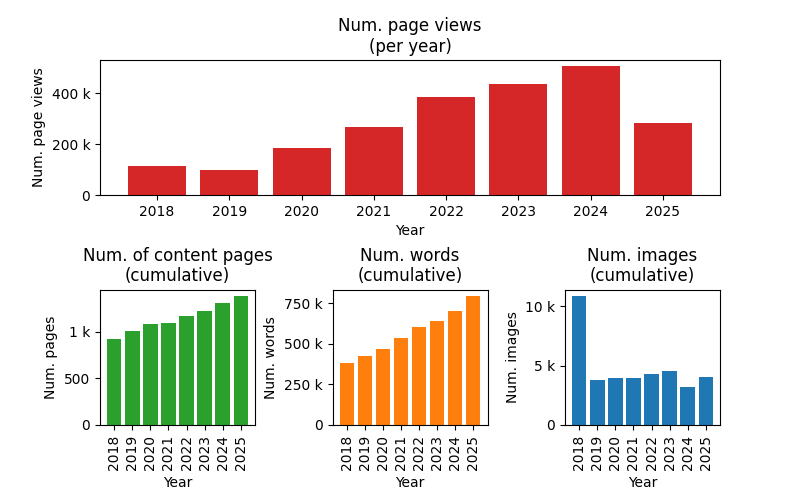 At the end of 2025 the site had 794k words, up from 704k words last year (an increase of 90k). These words were spread over 1382 pages (up from 1313 pages last year), and included 4,042 images (an increase of 820 from 3,222 images images last year). Note that I discovered a bug in the stats calculation code which was excluding .webp images from the total image count. I fixed this for the 2025 year, so the increase from last year will be inflated due to missed images in years prior.