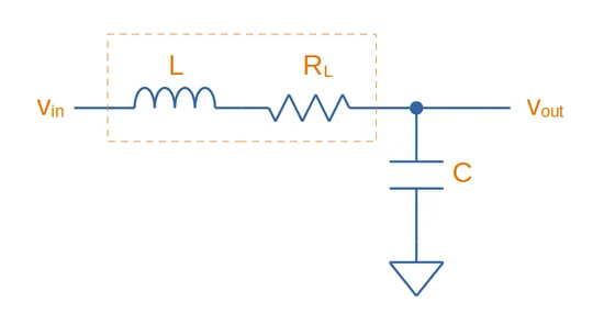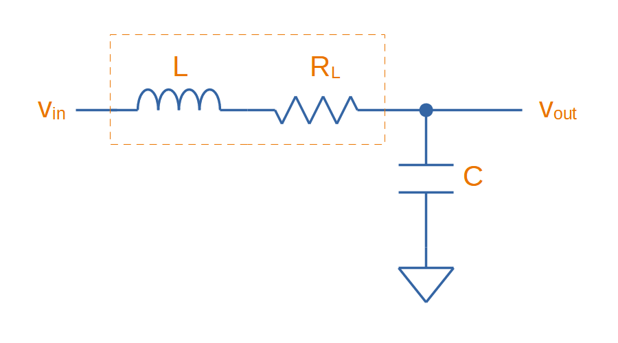The main parasitic element to consider with a low-pass LC filter is the parasitic coil resistance of the inductor, . Larger valued inductors typically have a larger coil resistance (due to more windings). This dampens the output signal.