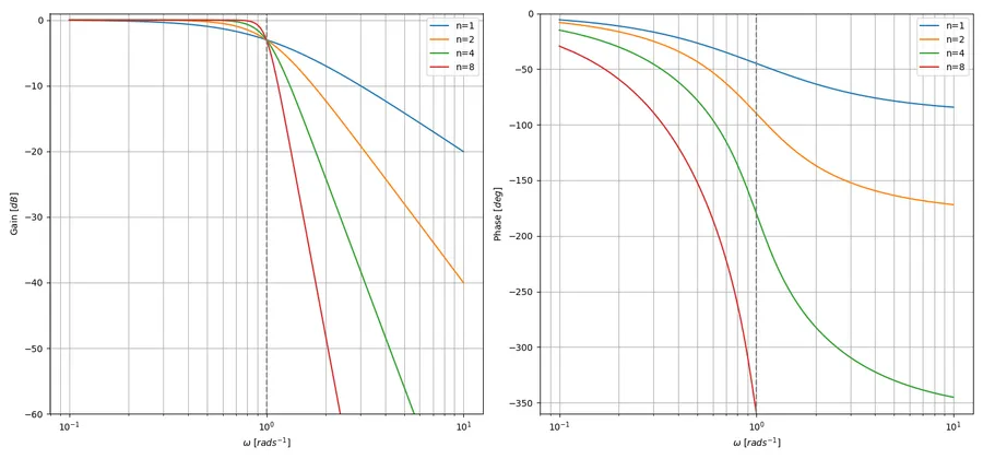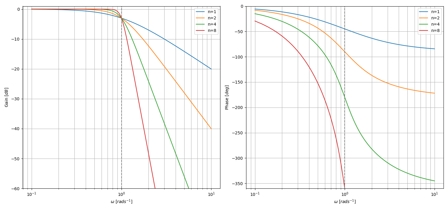 This transfer function gives the bode plots in This is a placeholder for the reference: fig-butterworth-bode-plot-for-various-n (by taking the magnitude and arg of the transfer function).