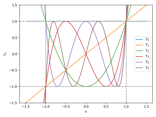 These are special polynomials in which the leading coefficient (coefficient in front of the highest power of ) is the largest value it can be whilst the polynomial is bounded between on the interval 4. You can see this interesting behaviour in the graph in This is a placeholder for the reference: fig-chebyshev-poly-graph. It shows the first 6 Chebyshev polynomials through to . Note that , and is somewhat hidden by the horizontal bounding line.