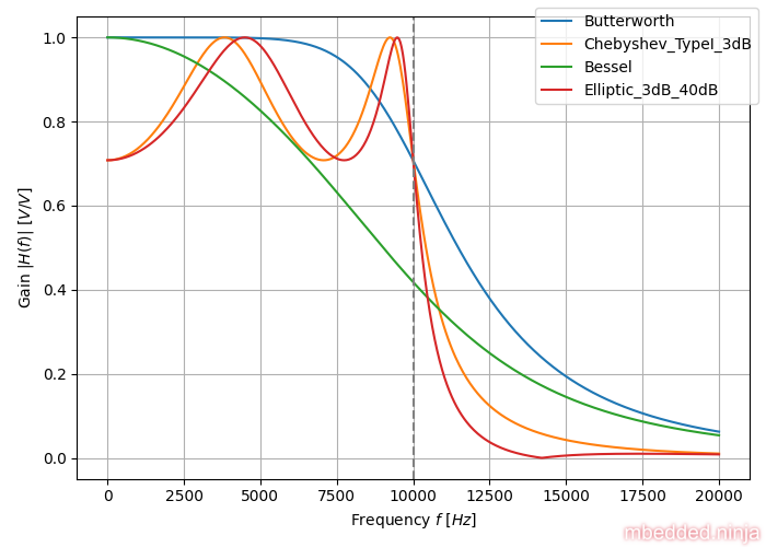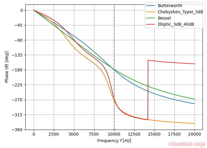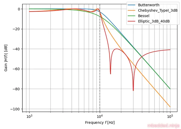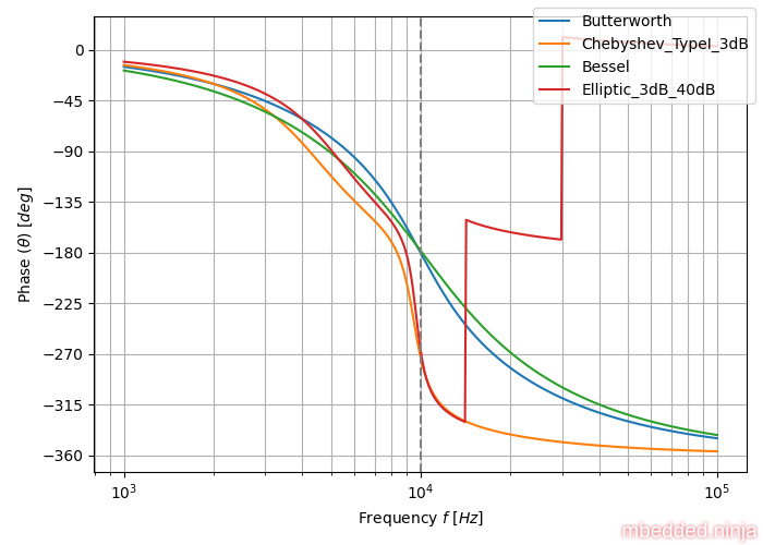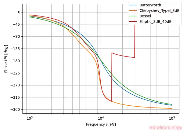 - Bessel: Optimized for linear phase response up to (or down to for high-pass filters) the cutoff frequency , at the expense of a slower transition to the stop-band. This is useful to minimizing the signal distortion (a linear phase response in the frequency domain is a constant time delay in the time domain).