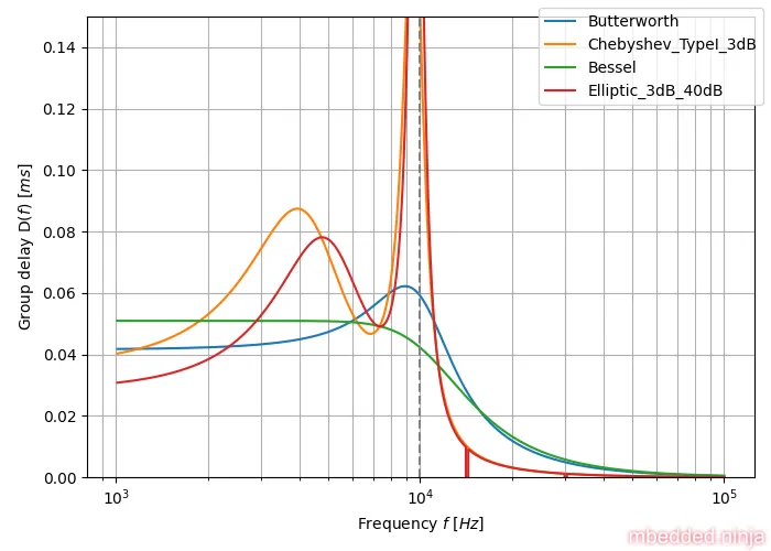 The visually demonstrate the flat group delay of the Bessel tuned filter, we can plot the group delay of the Bessel-tuned 4th-order low-pass filter vs. a number of other popular tunings. The below plot shows the group delay for Bessel, Butterworth, Chebyshev and Elliptic tuned filter. The critical frequency was set to for all filter tunings. All filters are 4th-order. As you can see in This is a placeholder for the reference: fig-tuning-comparison-group-delay, the Bessel tuned filter has the flattest group delay.