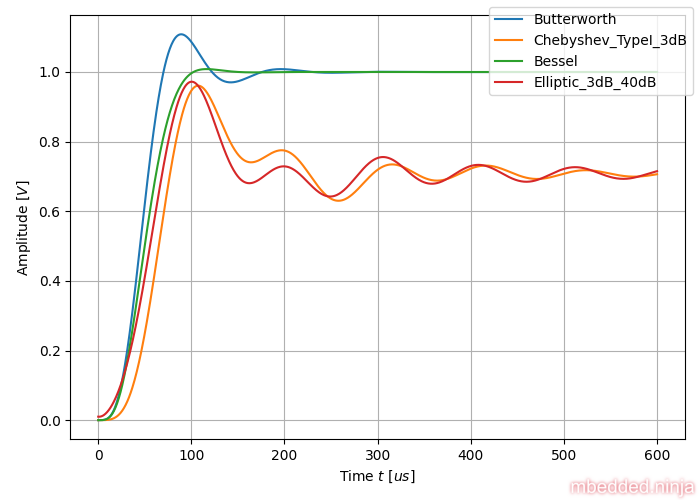 The Bessel-tuned filter shows the least amount of ringing. This is what we would expect, as the Bessel-filter is optimized to have the flattest group delay. All frequencies get delayed by roughly the same amount, and so the output is not “distorted”. Ringing is a result of different frequencies being delayed by different amounts of time (remember that an input step response essentially has frequency components at all frequencies, hence why it is a good testcase for a filter).