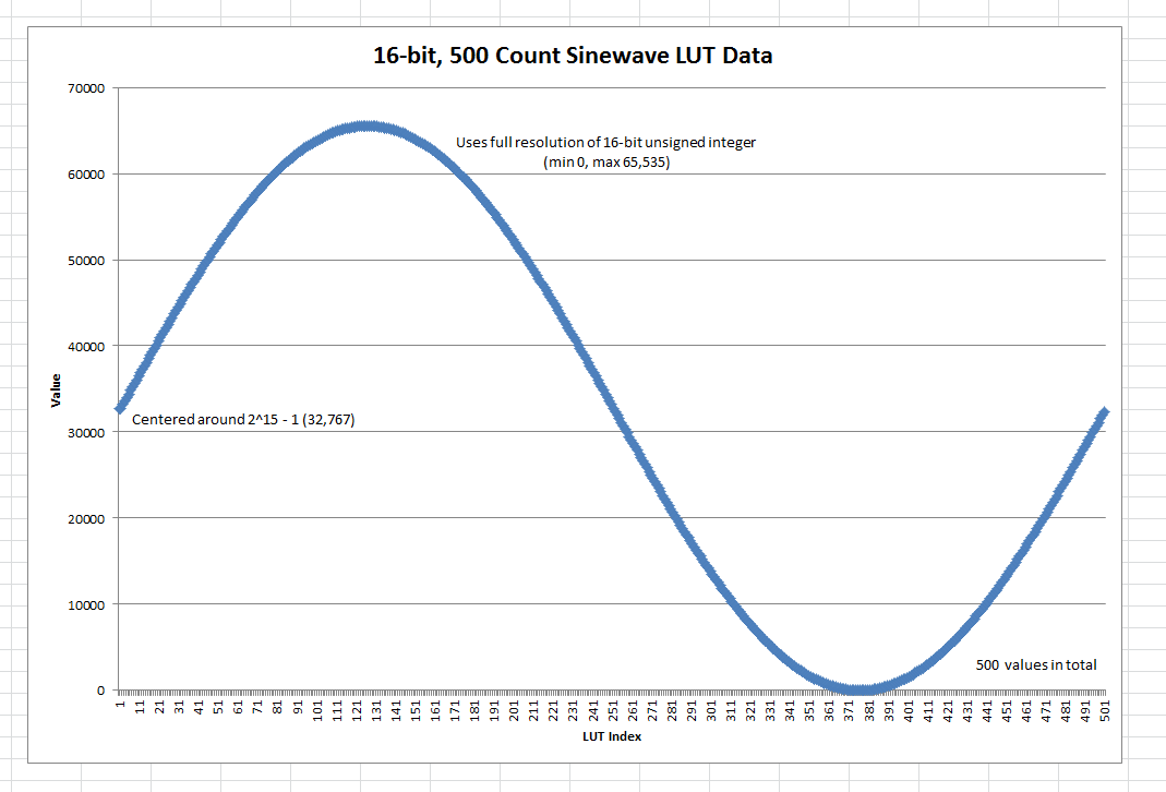 To implement third-harmonic injection, all you have to do is add the third-harmonic to the sine-wave LUT. The third-harmonic has an amplitude that is 1/6 of that of the fundamental (your original sine wave). You’ll notice that the maximum value in the LUT has decreased. At this point, scale up all the values in the LUT so they use the full-range again.