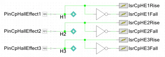 The schematic below shows the hardware used in a PSoC 5 microcontroller to perform hall-effect based trapezoidal commutation. With the correct mux selects, this control method can run completely from hardware and be completely processor independent (when running at a constant duty-cycle).