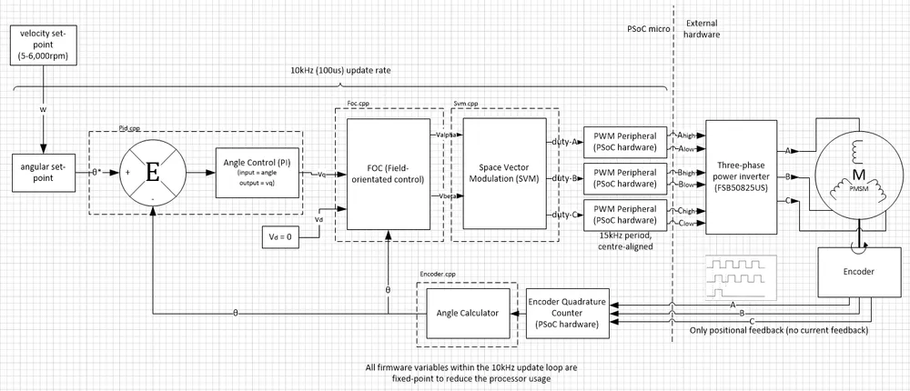 The following picture shows the control architecture for a PMSM motor controlled with a PSoC microcontroller.