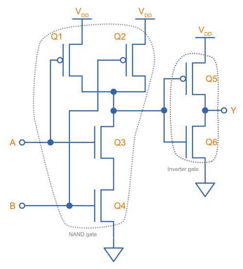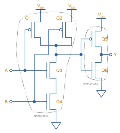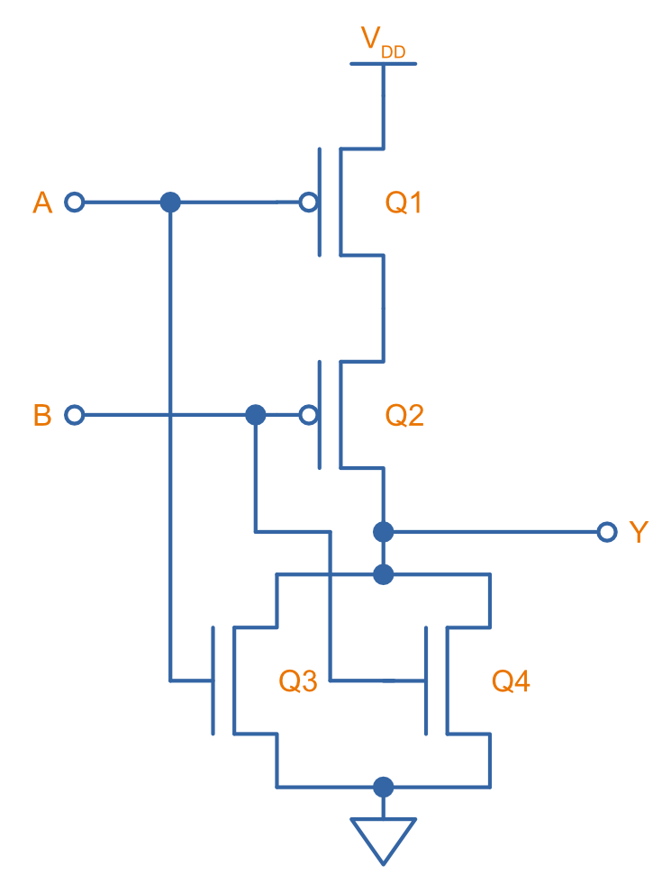 Two N-channels are connected in series on the bottom side, and two P-channels are connected in parallel on the top side. Both inputs ( and ) have to be HIGH to turn on both the lower side N-channel MOSFETs and drive the output () LOW. If either inputs are LOW, at least one of the high-side P-channel MOSFETs will be turned on, driving the output HIGH. This completes the NAND logic.