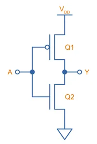 The inverter is the easiest CMOS logic gate to make! It just consists of one P-channel and one N-channel MOSFET in a “totem-pole” configuration, as shown below. On the right-hand side is an interactive simulation.