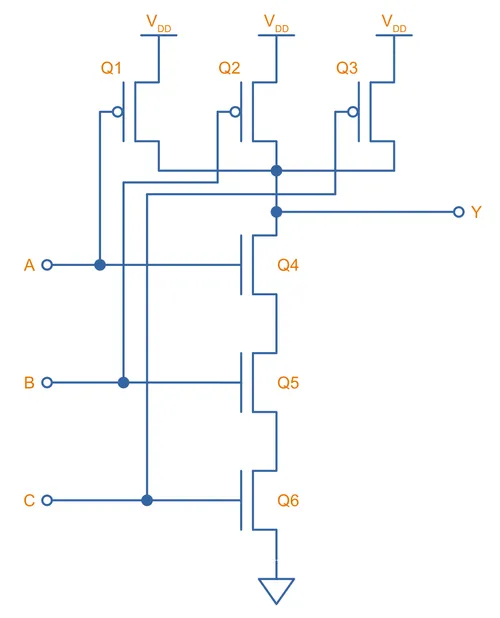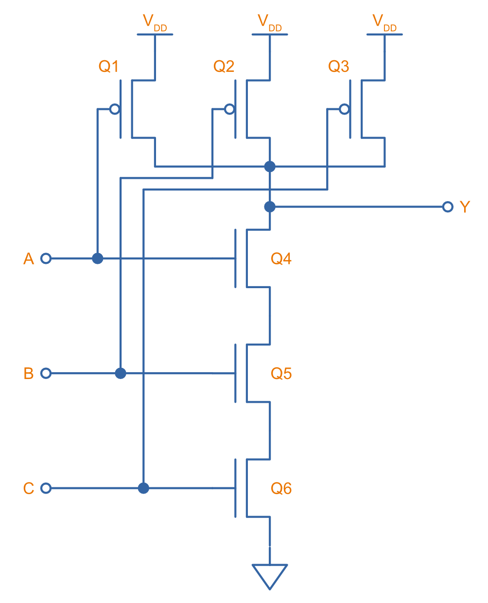 N-type Metal-oxide Semiconductor (NMOS) logic is a way of building logic functions from N-channel MOSFETs. In the early days of digital logic (1970s), it was much faster and easier to manufacture than CMOS, however since the 1980s CMOS took over and has become the dominant way of implementing logic gates6. NMOS is built from an arrangement of N-channel MOSFETs on the low-side (depending on the function) and a pull-up resistor on the high side.