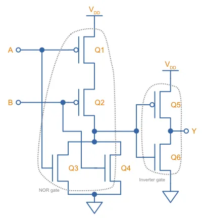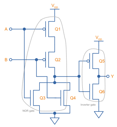 In a similar fashion to the CMOS AND gate, the simplist way to build a CMOS OR gate is to build a NOR gate and then add an inverter on it’s output.