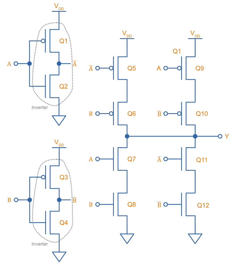 The CMOS XOR gate is the hardest CMOS gate primitive to build! It can be built with the circuit shown below, which uses a total of 12 MOSFETs, 3 times as many as the basic NAND and NOR gates!8