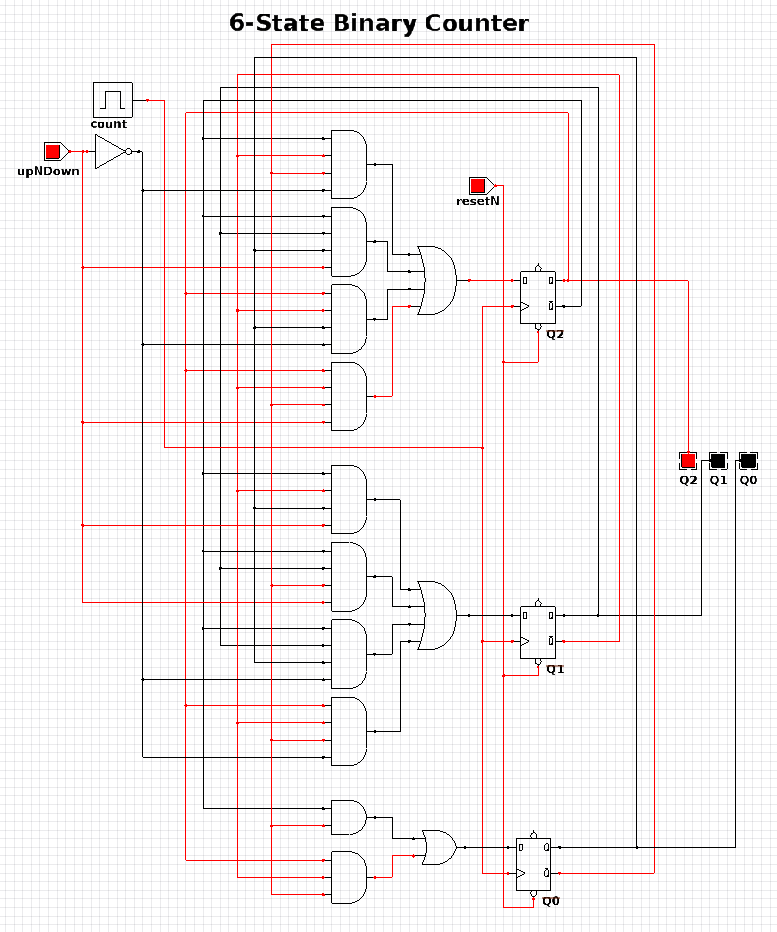 The 6-state binary counter is a counter which counts from 000 to 101 in the normal binary fashion before resetting back to 0. The output increments on every rising-edge of the count pulse, and the direction pin (upNDown) determines the count direction (when upNDown = 1, the counter goes from 000 to 101, when upNDown is 0 the counter goes from 101 to 000).