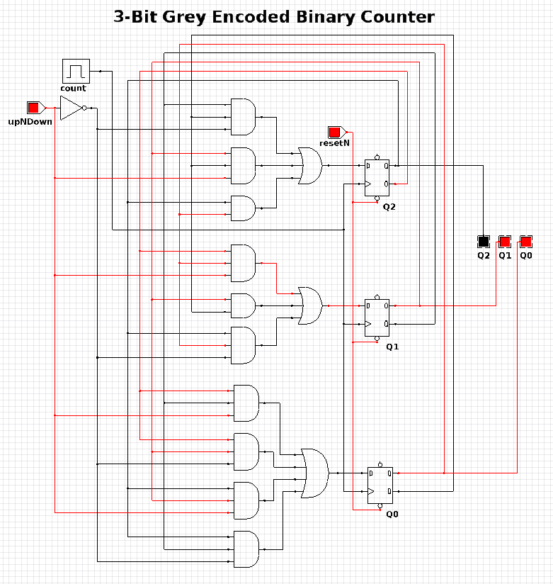 The 3-Bit Grey Encoded Counter is a counter that counts from 0 to 7 in binary in a grey encoded fashion. The counter increments on every rising edge of the bit ‘count’ and the direction bit ‘upNDown’ determines the direction of counting.