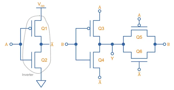 Complementary metal-oxide-semiconductor (CMOS) is a way of building logic functions from complementary pairs of N-channel and P-channel MOSFETs. Today, it is by far the most popular way of constructing digital integrated circuits (ICs)7. CMOS circuits typically have negligible static power dissipation and only consume power during transitions. It advances from NMOS technology by replacing the upper resistor with P-channel MOSFETs, which both eliminates static power dissipation and speeds up the low-to-high transition.
