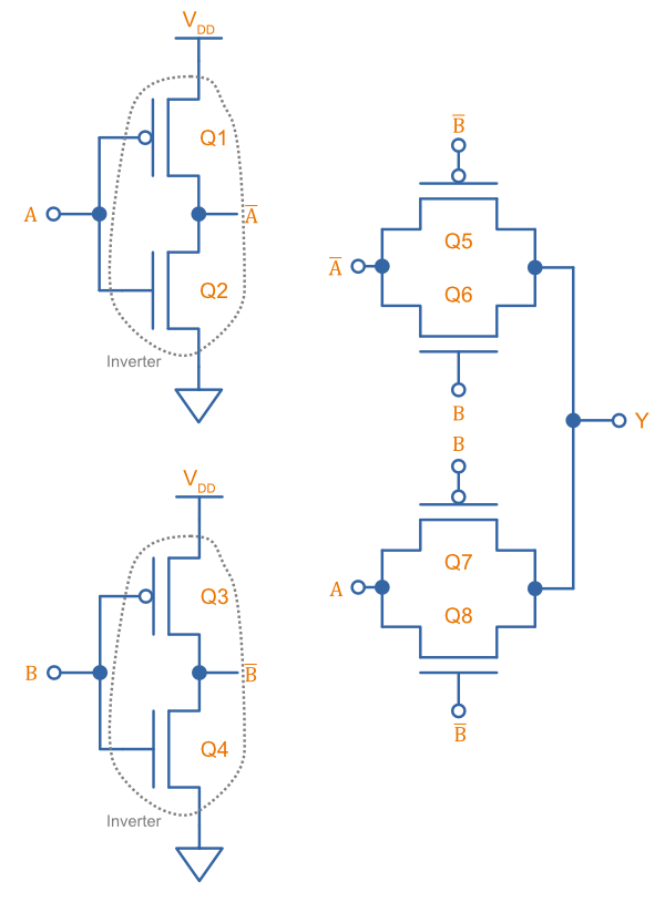 Above we showed how complex a XOR gate is to build in CMOS logic (12 transistors!). PTL logic can significantly reduce the transistor count for a XOR gate. One such implementaton is11: