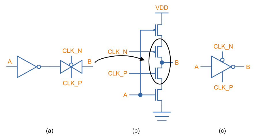 A useful building block for digital logic is a CMOS inverter whose output can also be tri-stated. The obvious way to do this would be connect the output of a regular inverter to a transmission gate, as shown in (a) in the figure below. But these MOSFETs can be recombined to make a single “totem-pole” stack which provides the same functionality, as shown in (b)9. In (b), the N-channel MOSFET of the transmission gate it connected in series with the N-channel MOSFET of the inverter on the lower leg. Likewise for the P-channel MOSFETs. This circuit is sometimes simplified to the symbol shown in (c).