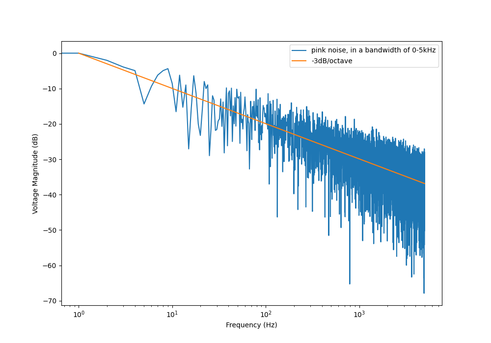 - Pink noise: Pink noise has a spectral power density proportional to .