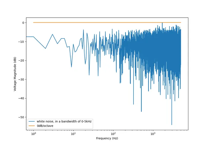 White noise has a flat power spectral density when plotted against frequency. White noise got it’s name from white light, which was assumed to have a flat power density spectrum across the visible range (the catch here is that, well, it actually doesn’t). White noise can be specified by a single constant noise power spectral density value.