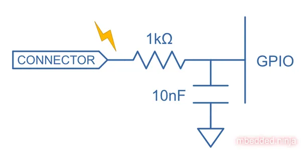 One thing to be aware of is that this will limit the maximum frequency that can be used through this IO line (more so that other ESD techniques, such as steering diodes as discussed below). The series resistor will form a low-pass RC filter with the parasitic capacitance on the line after the resistor. For short PCB traces, most of this parasitic capacitance will be from the input capacitance of the GPIO pin on the MCU. Something in the region of can be expected, which with a resistor will form a low-pass filter with a cut-off frequency of .