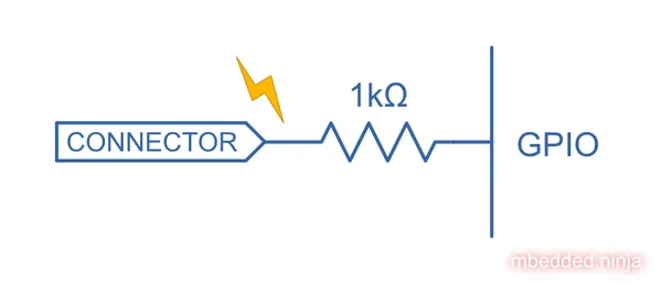 One of the simplest ways of protecting an I/O line from ESD is to add a series resistor, as shown in the schematic below:
