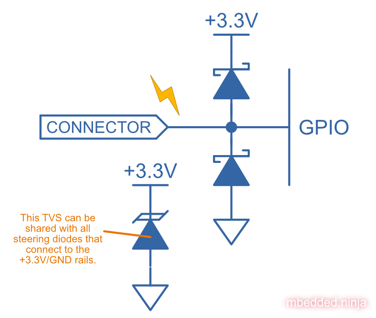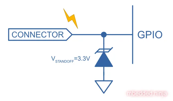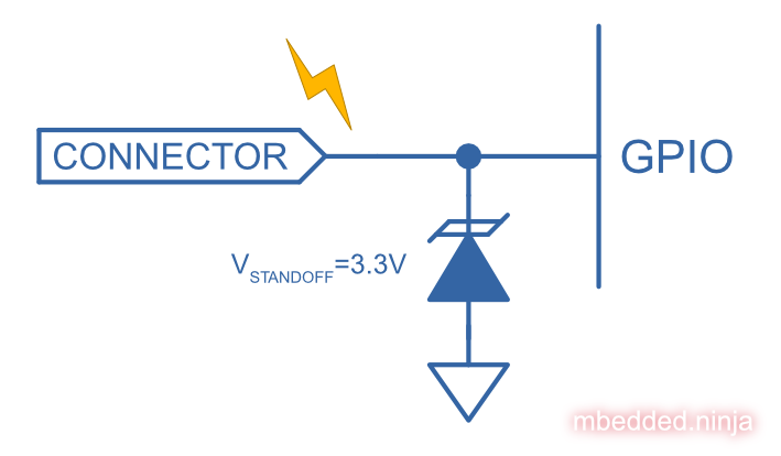 This page explains some of the ways you can go about protecting IO lines on a PCB from ESD events. This page assumes a basic scenario, you are wanting to protect an IO line that comes from an external connector and then connects to a GPIO pin on a MCU. The MCU is running from a +3.3V rail voltage (). However, the examples also apply to pretty much any IO line that connects to some sort of sensitive IC circuitry, e.g. enable pins on PSU ICs, communication lines, e.t.c.