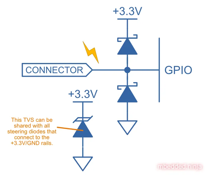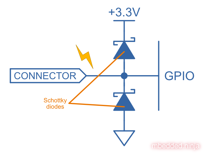 Steering diodes are connected between the I/O line and two voltage rails, typically and . You normally want to use Schottky diodes, as they have a lower forward voltage drop of around 0.3V compared to the standard PN junction diode forward voltage drop of 0.7V. This means your more robust external steering diodes will conduct and shunt more of the ESD energy away before the internal ESD protection diodes connected to the GPIO port in the MCU port do.