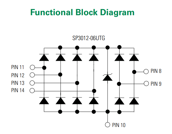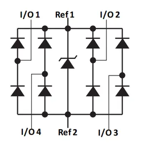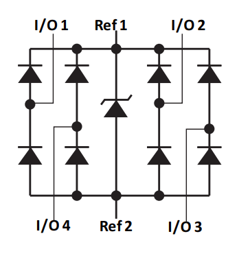 Another example is the Littelfuse SRDA3.3 steering diode array IC. It is designed to protect +3.3V IO lines and is rated to contact, air via IEC61000-4-23. It’s functional block diagram is: