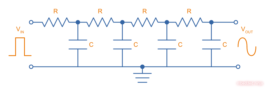 One RC filter does not provide enough attenuation of the higher harmonics. But we can stack many RC filters together until we get a sine wave which is “good enough”. One disadvantage of the RC filter approach is that the voltage gets attenuated through every stage of the filter. If this is going to be a problem, active filters can be used (or an amplifier could be added at the end).