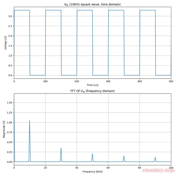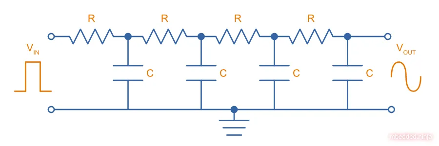 It’s also interesting to point out that the final output the sine wave has a DC offset of . This is because the DC component (average voltage) of the input square wave at duty cycle is . If you want to remove this bias, you can connect an AC coupling capacitor to the output to center the sine wave around .