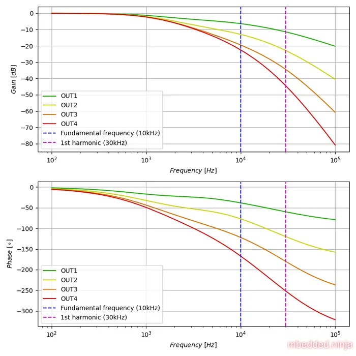 The bode plots (frequency response) of this circuit is shown below. Each successive filter stage increases the slope of the attenuation. At the fundamental frequency (which the frequency we want to pass) of , the attenuation is (14x reduction). At (which is the 1st harmonic of the square wave, and we want to block this), the output is attenuated by (178x reduction).