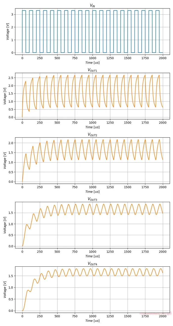 I added taps at the outputs of the intermediate stages so we can see how the waveform changes as it moves through the circuit!