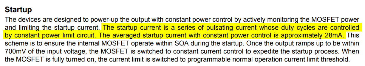 As highlighted in the below screenshot of it’s datasheet, during start-up it only supplies an average of 28mA to the load, even though the part is designed to pass up to 1.5A during normal operation1. If doesn’t climb to equal within 250ms during start-up, it times out. So any significant resistive load on the output that drew more than 28mA but less than 1.5A would always cause this IC time out during start-up. This suggests that it is designed to work in tandem with an external high-side switch that is placed between this circuit breaker IC and the load. If the high-side switch is kept off whilst the circuit breaker IC start-up, it will only have capacitance to charge up on it’s output, hence the 28mA will be ok (up to a max. capacitance, and explain how to calculate this in the datasheet).