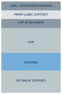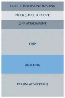 RFID inlays are a popular way form of cheap, disposable RFID tags. They are usually paper thin, flat, and contain both an embedded RFID chip and flat planar metallic antenna.