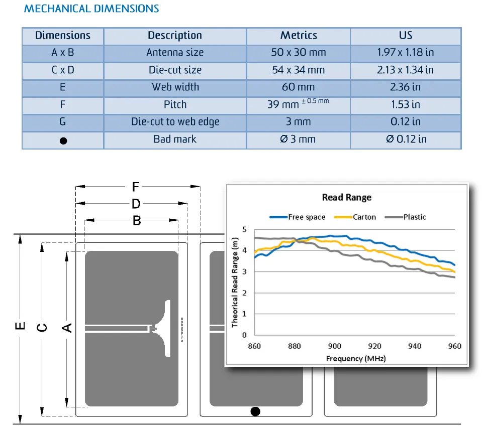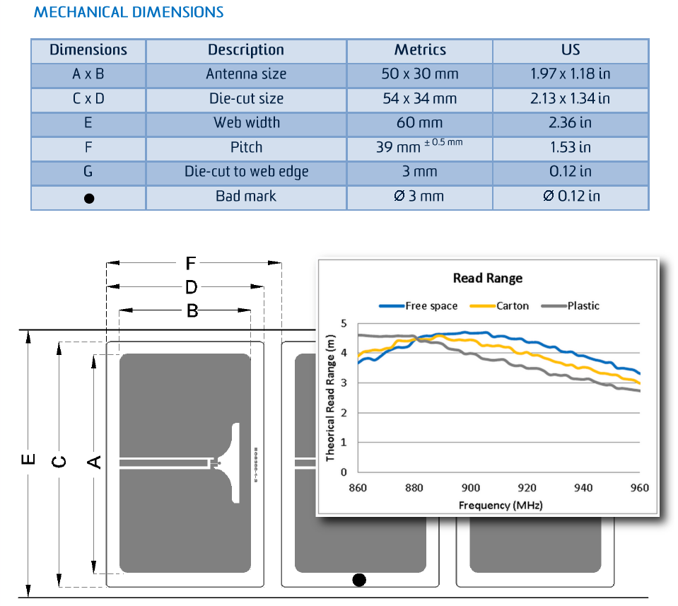 The following image shows the dimensions of a typical inlay (the Tageos EOS-300), along with a graph of the measured read distances when it is attached to a number of different materials.