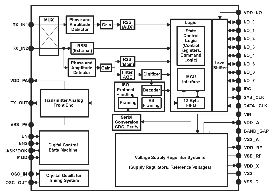 Stand-alone ICs also exist. The following image is the block diagram for the Texas Instruments TRF7960A 13.56MHz RFID transceiver IC. TI provides example C firmware code for this device on both the MSP430 and 32-bit ARM architectures.