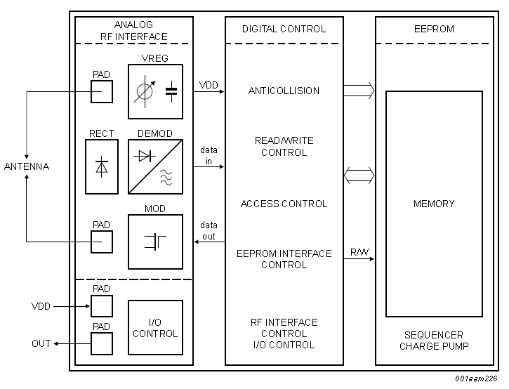 Passive tags have no physical power source and instead get all of their power from the incoming RF signal transmitted by the reader. Passive tags usually don’t have an option for external circuity, as they require to run of extremely low amount of energy. However, there are a few passive chips which provide a single I/O pin, which can be used as an input, output, or either (which is called a GPIO in the embedded world), depending on the chip. This includes the Microchip MCRF202 and Atmel ATA5570, which both operate in the LF band, and the NXP UCODE SL351213FTB0, which operates in the UHF band.