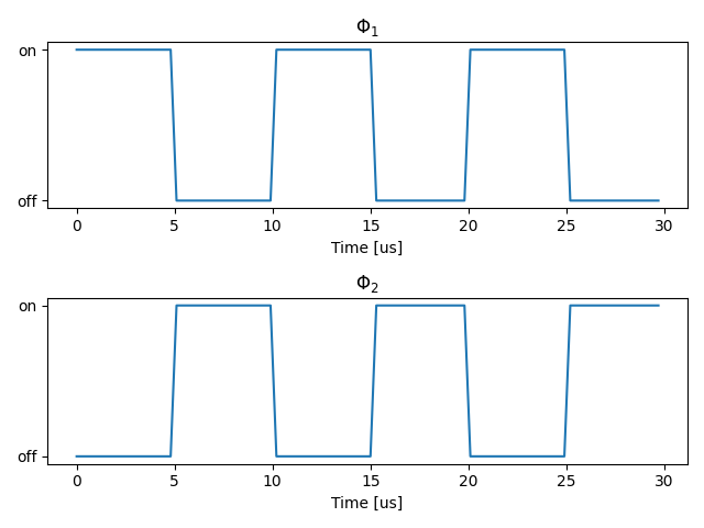 The switches are switched on/off in an alternating fashion, where controls SW1 and controls SW2. This is shown in the below graph. A switching frequency of is assumed.