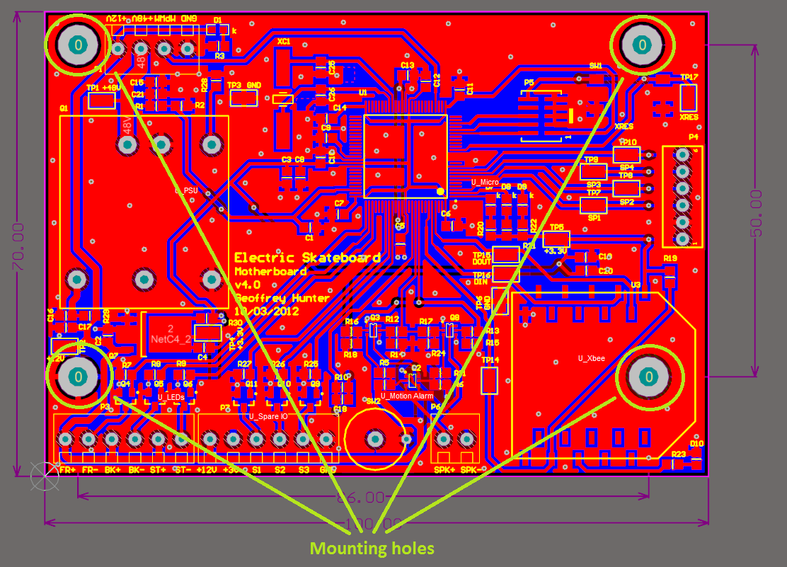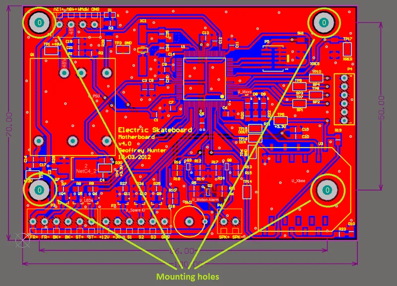 Don’t forget to consider how the PCB is going to be mounted. One of the most common things accidentally left of a PCB. Normally all it requires is four holes (un-plated) in the corners for screwing in bolts/supports or just enough free PCB space to stick on rubber feet. M3 bolts and nuts are commonly used. Remember to consider the implications of using metal bolts next to/on-top of electrical signals. There are nylon bolts and washers when insulation is needed. Lock-tight can be good to prevent bolts/screws from undoing. The following picture shows the four mounting holes on a PCB. Notice one is underneath a component (the Xbee module).