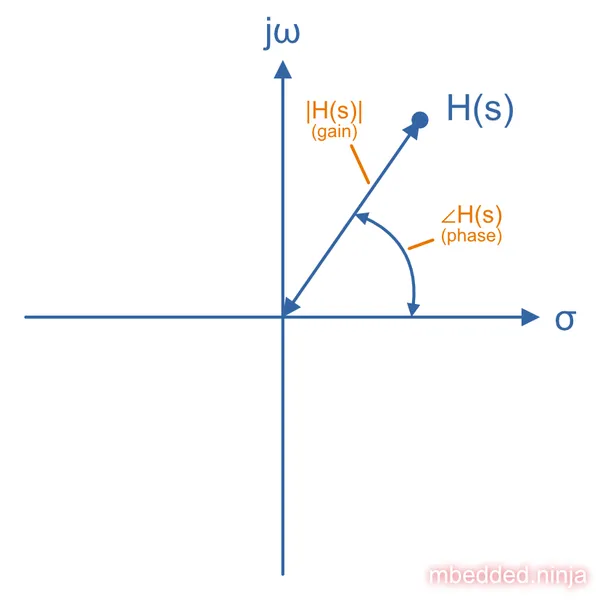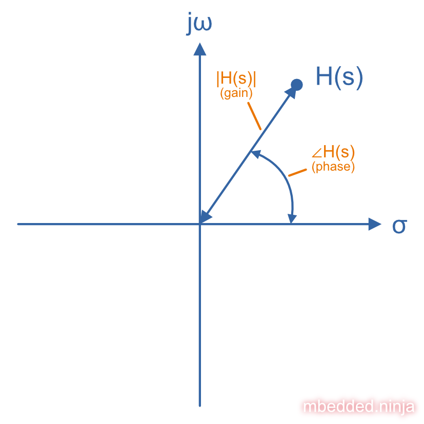 Note that because we are using the complex variable , the transfer function encodes both magnitude and phase relationships between the output and input. On it’s own, it’s complex in nature and not really useful for deducing anything “measurable”. But, using two clever tricks, you can separately extract the magnitude and phase response equations from . The below diagram shows the value of at a single frequency , and how the magnitude and phase information is encoded in this (more on this below).
