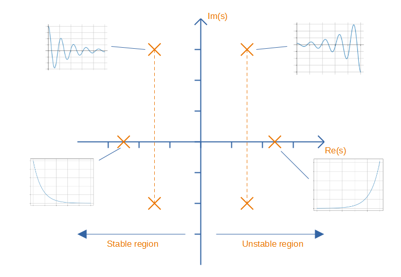 Poles are normally drawn as X’s on the graph, and zeroes as O’s. Unless you are building an oscillator, poles in the right-hand half of the plane (having a positive real component) are a bad thing, as they represent an instability.