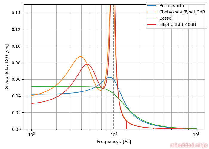Group delay for a number of 4-order filter tunings is shown below. The Bessel filter tuning aims to have maximally flat group delay across the pass-band of the signal (at the expense of other metrics we don’t talk about here). You can see this in the plot with the straight green line.