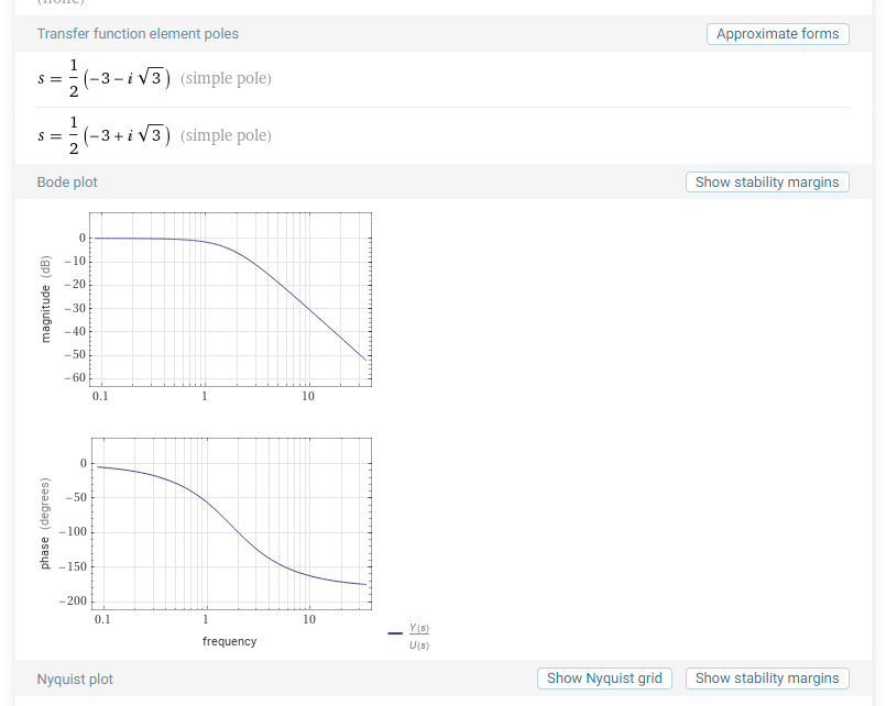transfer function (3)/(s^2+3s+3)It will spit back at you things like the unit step response, state space representation, zeroes and poles, bode plot, Nyquist plot, Nichols plot, Root locus plot, gain margin and phase margin2. Click here to jump to these results in Wolfram Alpha.