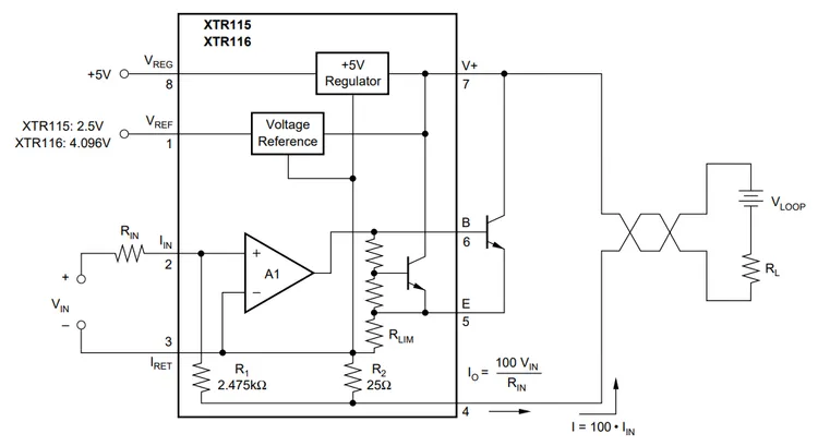 The Burr-Brown (now Texas Instruments) XTR115, XTR116, XTR117 are loop-powered 4-20mA current loop transmitters. Their typical application schematic is shown in .
