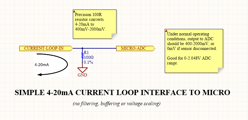 The schematic below shows probably the simplest 4-20mA interface you could build to an ADC on a microcontroller. It uses just a single, precision (100\Omega) resistor to convert the 4-20mA signal into a 400-2000mV voltage.