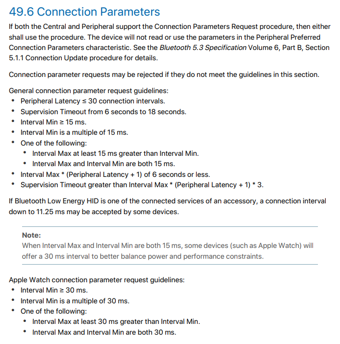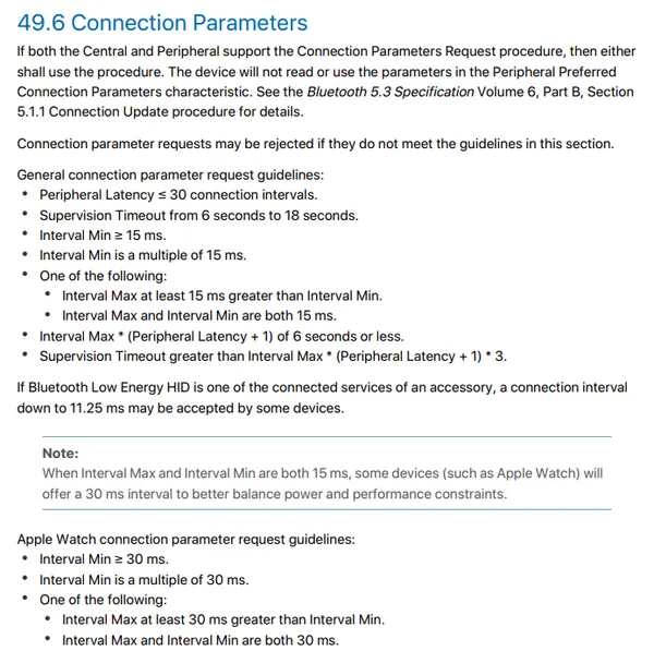 A screenshot of the BLE connection parameters from Apple’s document is shown below: